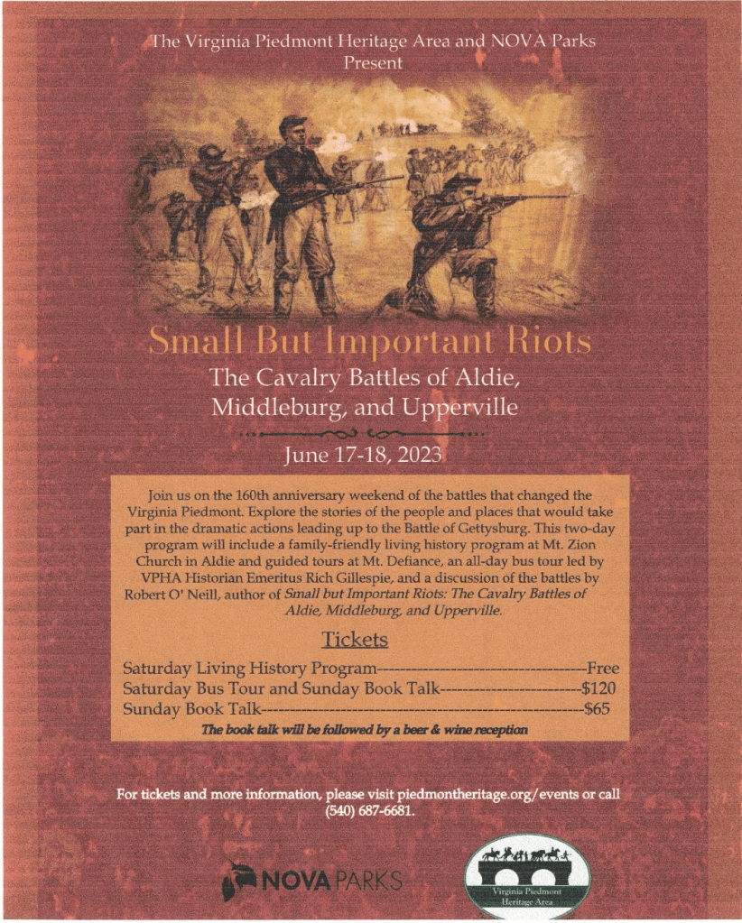 These events are presented by the Virginia Piedmont Heritage Area as well as Northern Virginia Parks. There is a cost involved in support of the two organizations, but also a beer and wine reception after my presentation on Sunday. And, of course, I will have copies of Small but Important Riots, The Cavalry Battles of Aldie, Middleburg, and Upperville for sale.